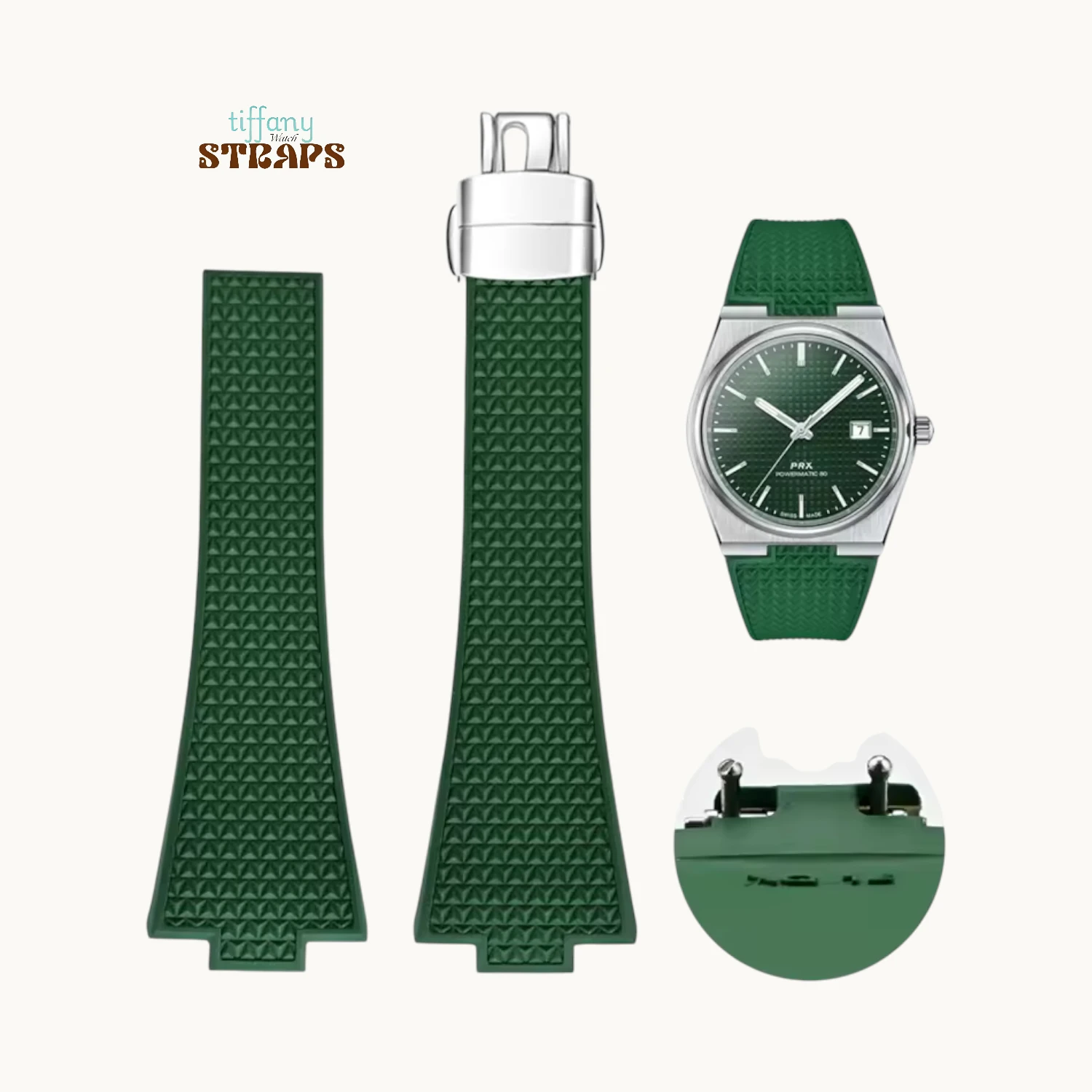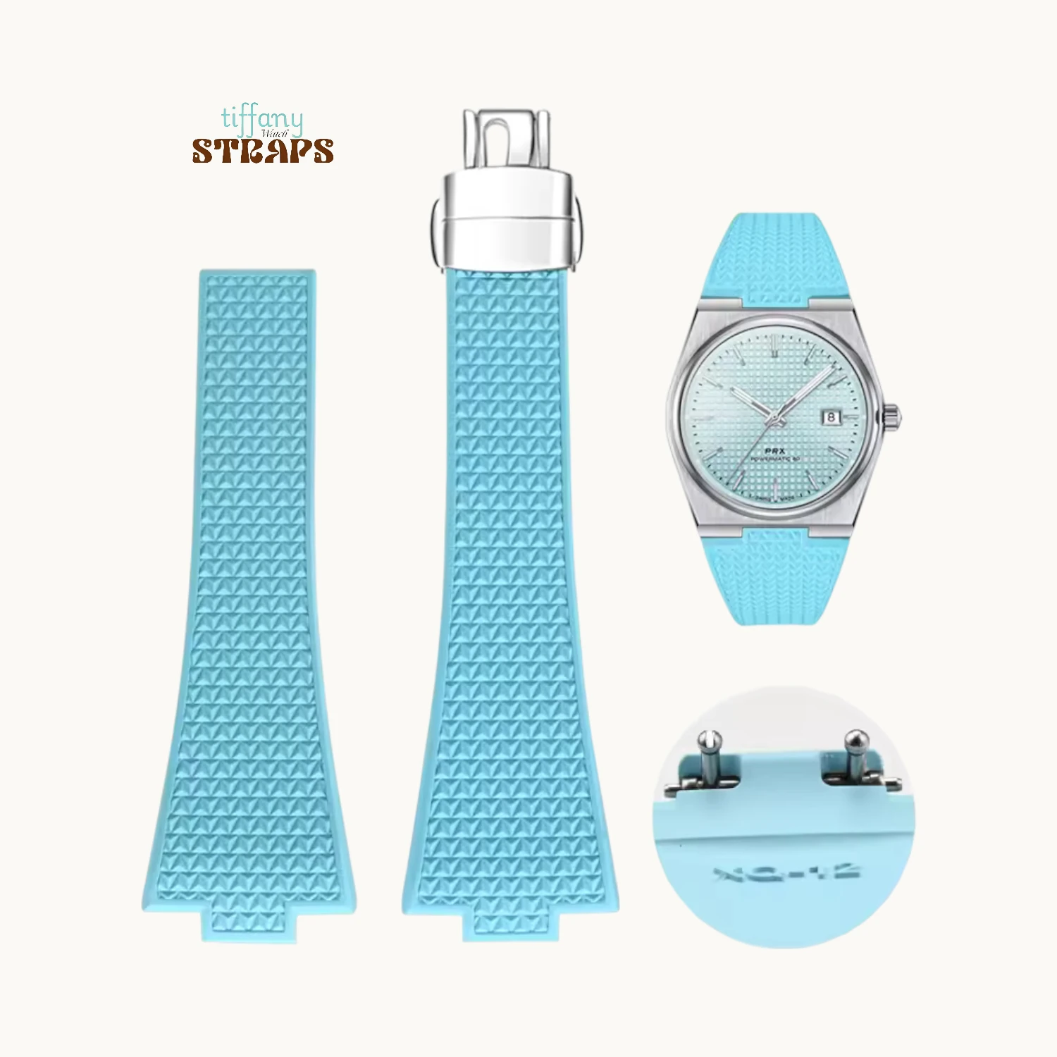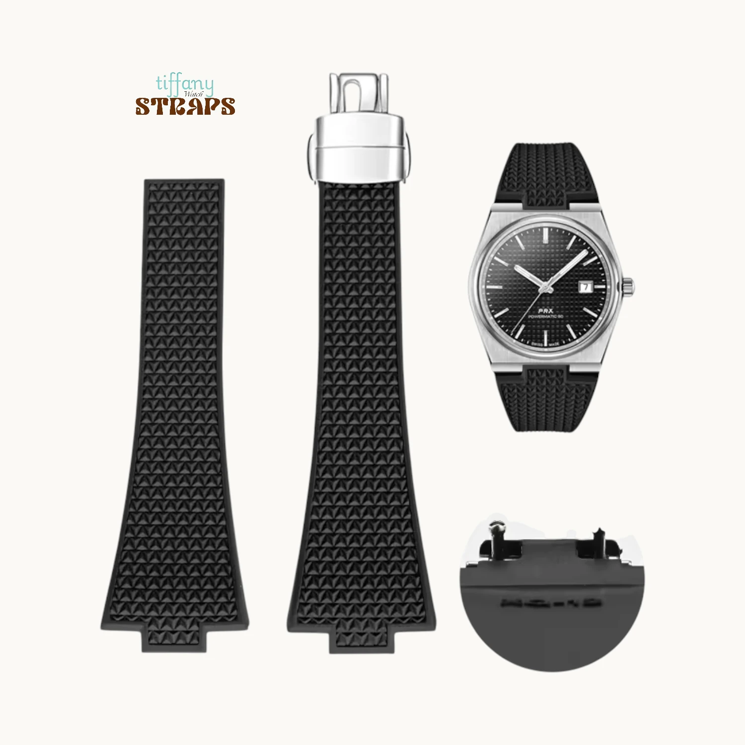 Quick ReleaseSporty precision with a tailored fit. Our PRX FKM‑CTS Strap with Clasp uses premium FKM fluoro‑rubber, known for its excellent resistance to heat, sweat, and daily wear, while staying comfortably flexible on the wrist. They feature a cut‑to‑size design so you can trim the strap for a custom fit, paired with a sleek metal clasp and a double‑push quick‑release mechanism that keeps the profile clean and secure. Discreet surface texturing adds grip and a refined, modern look that suits the PRX’s integrated case shape perfectly.